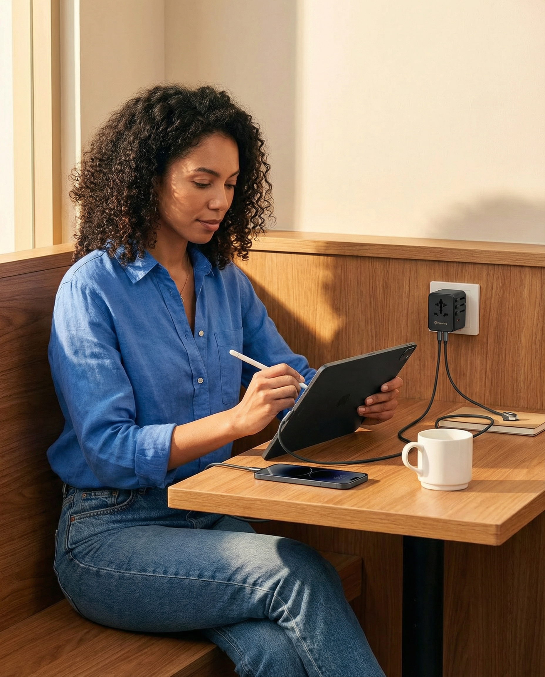 Χάρη στον ενσωματωμένο παγκόσμιο αντάπτορα (US / EU / UK / AU) και την έξυπνη κατανομή ισχύος, μπορείτε να συνδέσετε ταυτόχρονα κινητά, tablets, laptops, power banks και άλλα gadgets, απολαμβάνοντας άνεση, οργάνωση και απόλυτη αξιοπιστία στο ταξίδι σας.