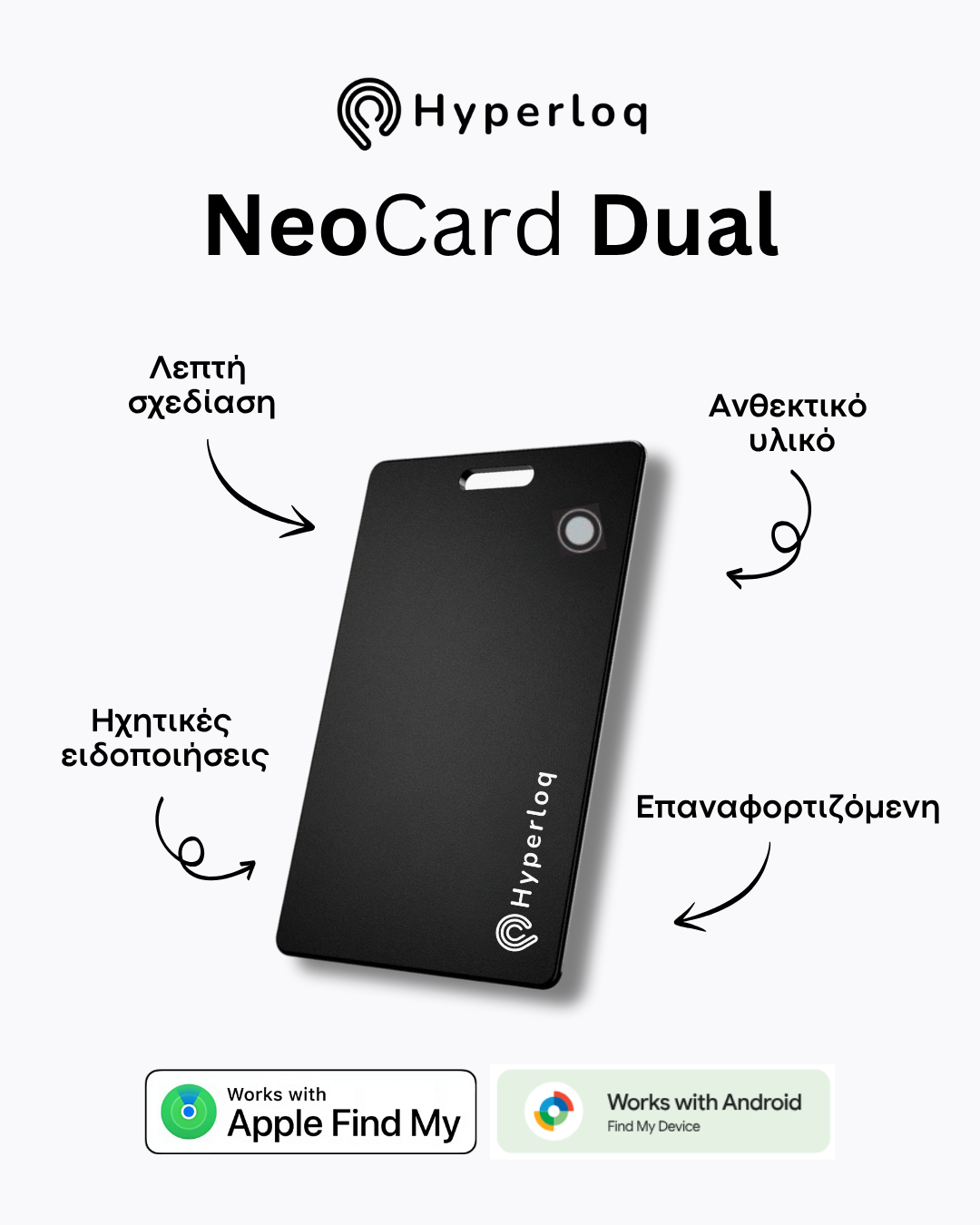 Το Hyperloq™ NeoCard Dual συνδέεται άμεσα με το smartphone σας μέσω των εφαρμογών Apple Find My και Google Find My Device, επιτρέποντας αξιόπιστη παρακολούθηση σε πραγματικό χρόνο. Χάρη στη σχεδίαση τύπου πιστωτικής κάρτας, χωράει τέλεια σε πορτοφόλια, θήκες καρτών, ταξιδιωτικά έγγραφα ή τσάντες, χωρίς να προσθέτει όγκο.